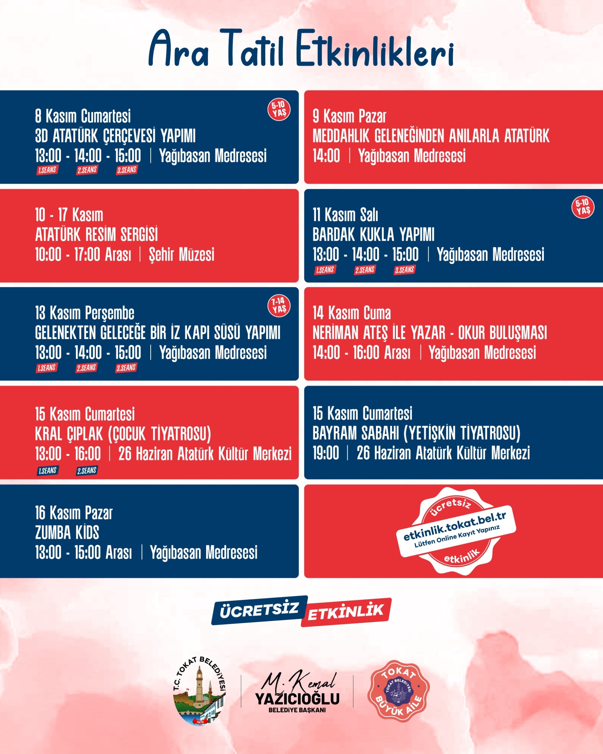 8 Kasım, 11 Kasım ve 13 Kasım tarihli etkinliklere katılımlar için etkinlik.tokat.bel.tr